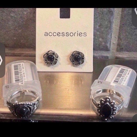 Forskjellige smykker, halskjeder, armbånd og diverse, tekst og pris under hvert bilde.