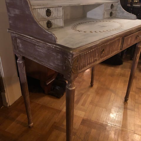 Vakkert sminkebord i gustaviansk stil med klassiske detaljer og speil. Bordet har god oppbevaringsplass og passer perfekt både som dekor og i bruk.