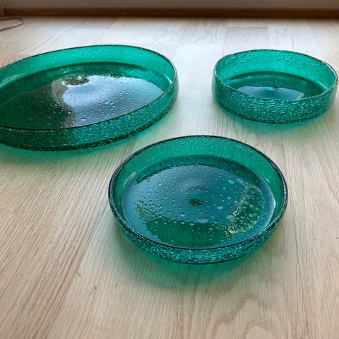 Diverse deler. Kakefat 32 cm, 11 store fat 23 cm, 8 små fat 17 cm, 8 desertskåler 14 cm. 5 koppefat 14,5 cm, 1 glass høyde 12 cm.