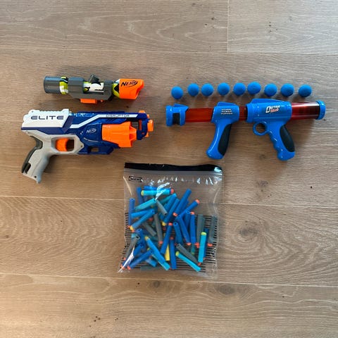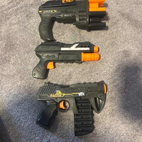 Fant en nerf liggende på loftet. Funker fint, jammer seg hvis du skyter uten pil. Kan deles i tre deler og man kan legge til kikkert sikte og lage noen komboer.
