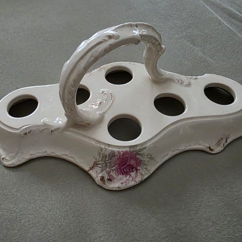 Kjempefin gammel egg oppsats til 6 stk egg og med tilhørende salt bøsse. Toppen av salt bøssen er i porselen og resten av oppsatsen er av blankt metall.
