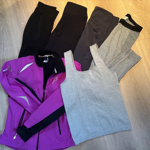 Sports tights og to topper som passer sammen. Jeg er Str. S, noen ganger M, alt passet fint. Den ene toppen er vid passform. Buksa er capri lengde.