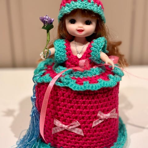 Søkeord: Håndlaget Retro Gammeldags Heklet Hekling Dukke Dokke Dorull Toalett Bad Pynt Håndarbeid Fargerikt Hjemmelaget Kjole Gaver