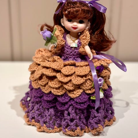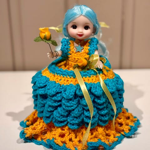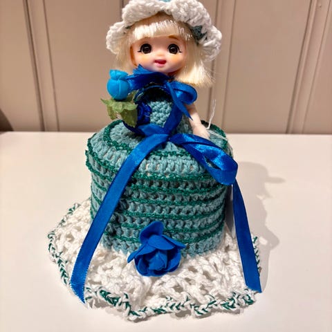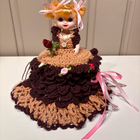 Søkeord: Håndlaget Retro Gammeldags Heklet Hekling Dukke Dokke Dorull Toalett Bad Pynt Håndarbeid Fargerikt Hjemmelaget Kjole Gaver