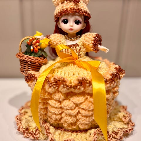 Søkeord: Håndlaget Retro Gammeldags Heklet Hekling Dukke Dokke Dorull Toalett Bad Pynt Håndarbeid Fargerikt Hjemmelaget Kjole Gaver
