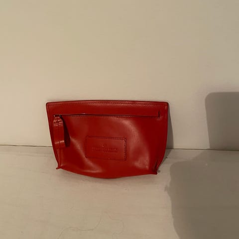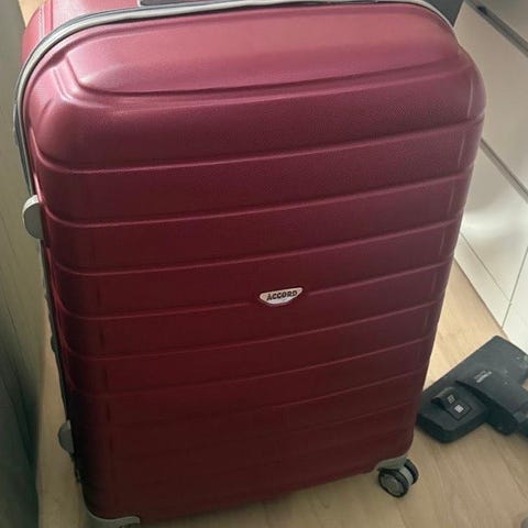 Rød koffert, brukt et par ganger. Noen få merker, ikke så synlig.