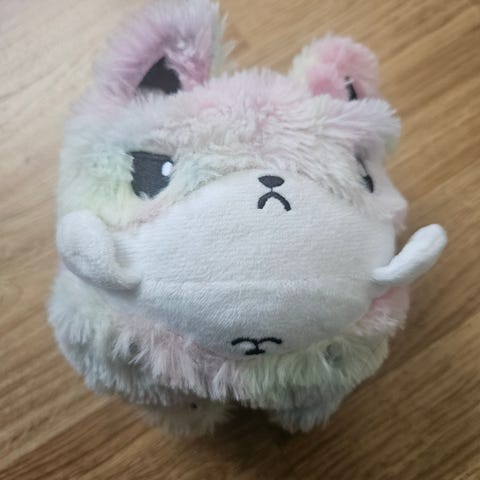 Plysj hund kosedyr i hvit og grå farge. Mykt materiale, egnet som leketøy eller dekorasjon.