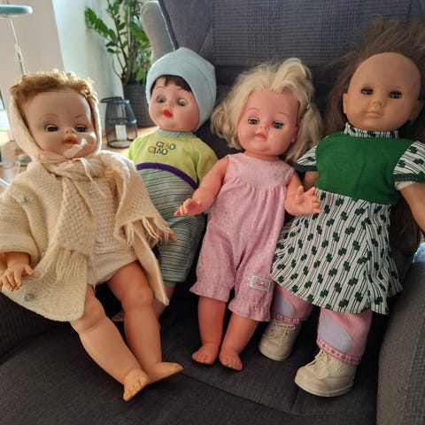 Ca 40 cm lange, øynene har gått inn I hodet og de er uten hår. De er lekt mye med og vært sammen i alle år. Selges samlet for 200kr.