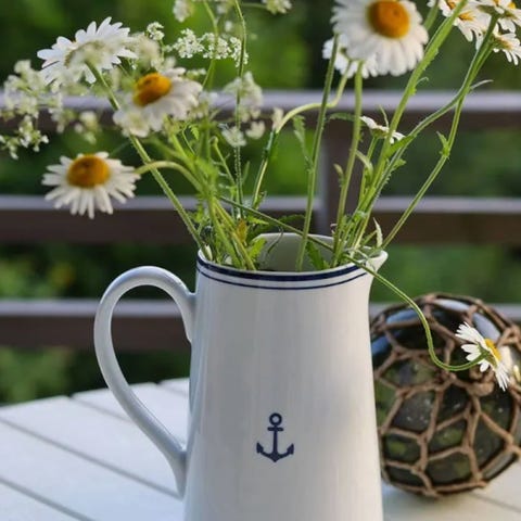 Muggen rommer 5 dl og er 12 cm høy. Den har noe gullslipp på kanten og en sprekk i tuten (se bilde), men likevel veldig fin med blomstene på den hvite bakgrunnsfargen. Muggen er stemplet SP (sanitærporselen), dvs at den er produsert i perioden 1948-52.
