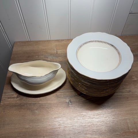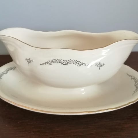 Selger to sausenebb fra Stavangerflint i mønsteret Dukat. Lyseblått med gull.