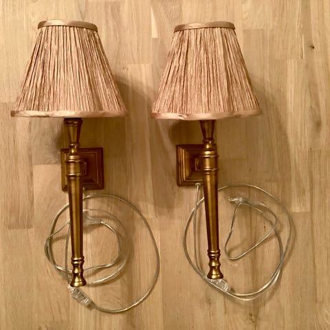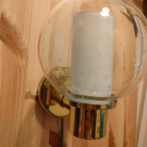 Vi bytter ut denne vegglampetten på hytta med annen modell. Denne Høvik Verk 7171 kalles også kirkelampett av noen, har vi sett. Messing.
