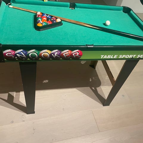 Biljard bord / polo table. Korte ben for å kunne ha det på et bord eller om man ønsker å sitte på gulvet. Det er brukt maks et par ganger, bærer ikke preg av dette. Ellers har det bare blitt lagret i eksen sin. Må hentes