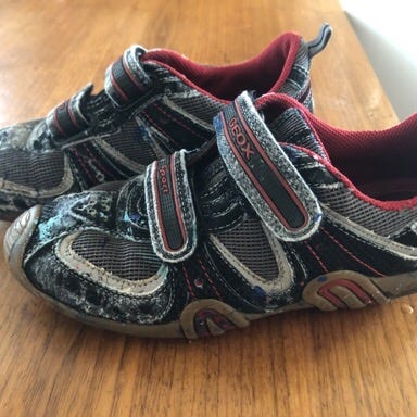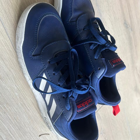 Puma sko str. 32. Skoene er ikke veldig slitt eller mye brukt, men den ene skoen har fått seg et hull i stoffet, se bildet. Gis derfor bort.
