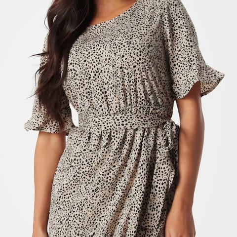 Nydelig midi wrap-kjole fra Only i lys lilla med søte små prikker. Fine puff-ermer, v-hals og volangkant nederst – så feminin og flatterende!