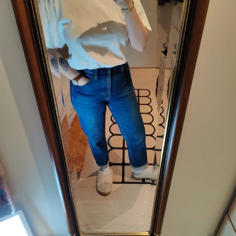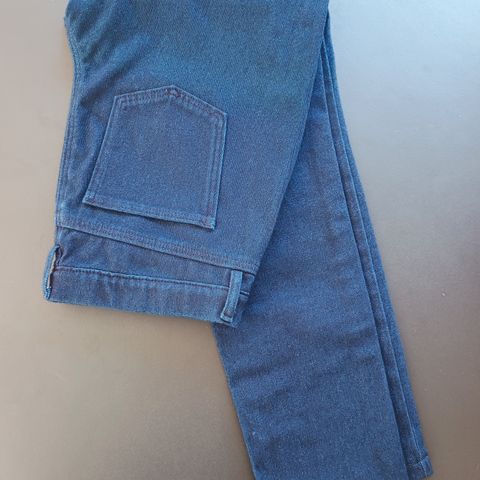 Pent brukte klassiske mørkeblå jeans fra Uniqlo. Midwaist. Mye stretch. Flekken på kneet er vanlig vann.