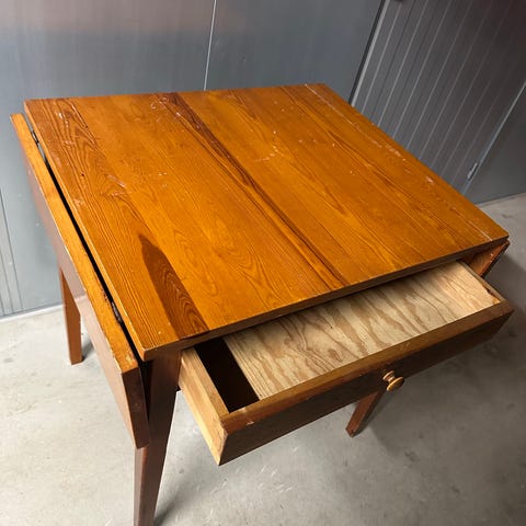 Allsidig pent brukt bord med ståltopp til bruk på kjøkken, utegrilling, hobby, vaskerom, garasjen, o.l.