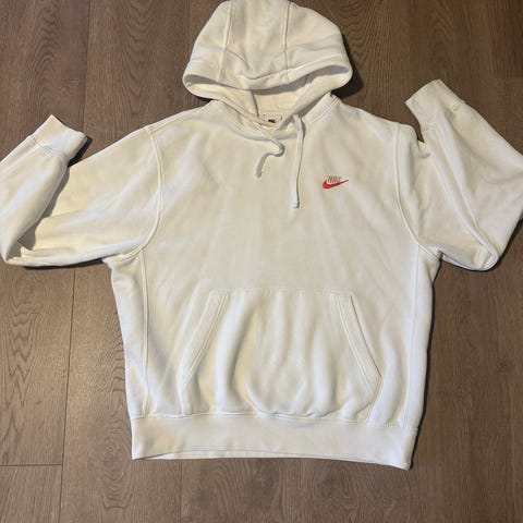 Genseren er hvit med hette og justerbar snøring. Den har kengurulomme foran og ribbestrikkede mansjetter og kant nederst. På brystet er det flere Nike-logoer, og på ryggen stor Nike World Tour-print med bynavn. Det er også neonfarget skrift langs det ene ermet.