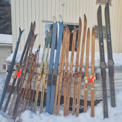 Pent brukte antikke hoppski til salgs. Fin å ha på en hyttevegg f eks.