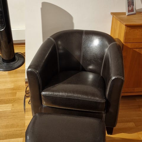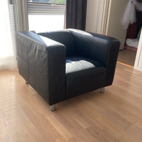 Selger to flotte klubbstoler i sort kunstskinn. Stolene har et elegant og tidløst design med avrundet rygg og lave armlener som gir god komfort. Perfekt for stue, kontor, venterom eller gang.