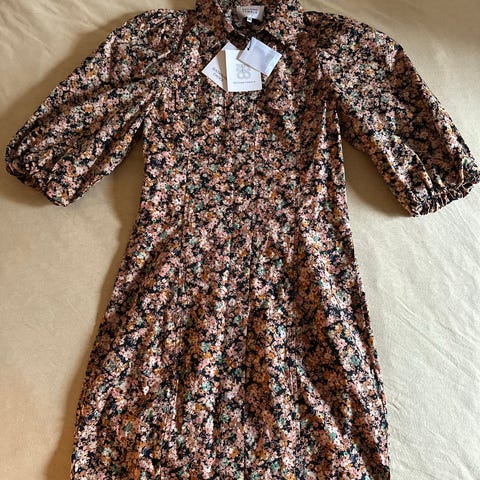 Kan brukes på sommeren, men ser også fint ut med høye støvler og belte på. Behagelig stoff. Lommer på sidene. 3/4 puff ermer. Er ganske vid, så størrelsen XS kan passe til S og M også.