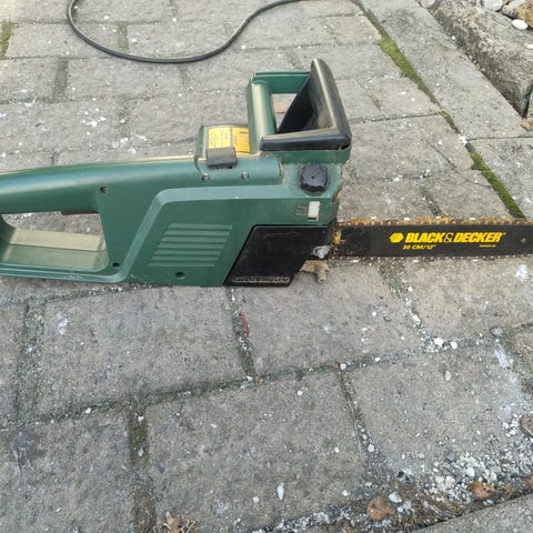 Elektrisk motorsag fra Black & Decker og oljekanne
