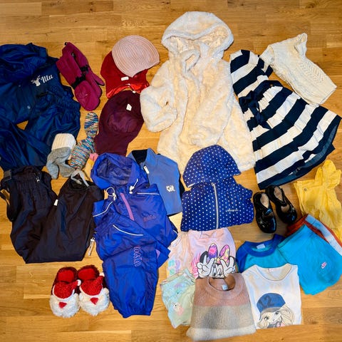 Stor klespakke til jente innholder kjoler, tuniker, bukser, 2 fleece jakker, fleece bukser, gensere, Hestra vinter votter, vår/høst lue. Mest klær er fra Lindex. I tilegg mye klær i størrelsen 122 som er ikke på bilder.