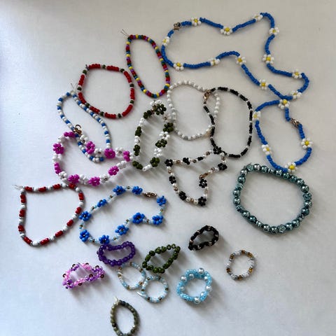3x armbånd i glass til våren og sommeren, gul grønn rød blå grå