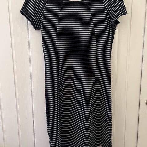 Jeg selger en midi sommerkjole i blå og hvite tynne striper fra Hennes & Mauritz Logg kolleksjonen i størrelse M