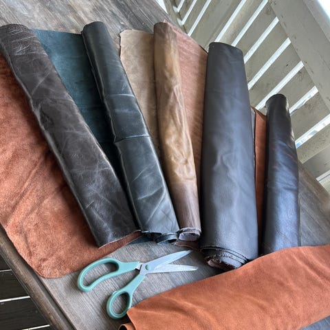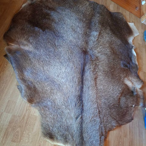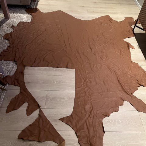 Rester fra skinnstoff selges. Farge:brun. Lengde:2 meter, bredde: 87 cm på det smaleste. Mykt og fint skinn