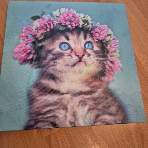 Et gøyalt kattebilde i sort, hvitt og sølv med motiv av en katt med mus i øynene. Motivet er kunst av Albert Dubout Les Yeux Doux fra Chats de Dubout. Det er trykket/malt på en keramikkflis og har et enkelt oppheng med tre og tråd. Værhårene på bildet er uthevet i sølvfarge.