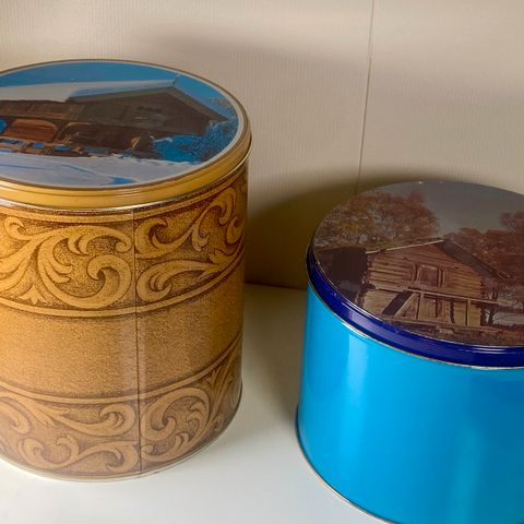 Begge bollene har en rosemaling dekor som imiterer en rosemalt trebolle. Den ene er litt kraftigere i fargene enn den andre. 17 cm i diameter og 7 cm i høyden. Selges samlet.