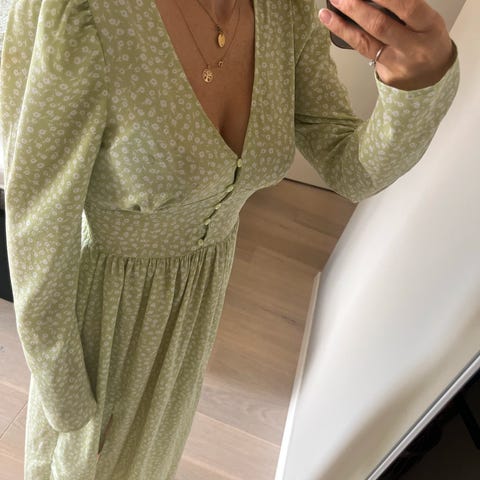 Søwger en lett og fin kjole. Grønn med detaljer. Størrelse XS men passer en small