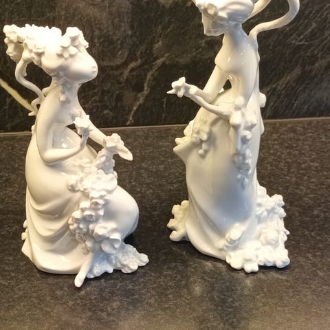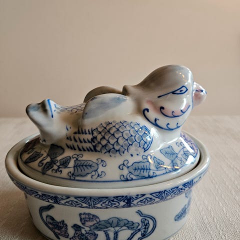 Den øverste delen er i god stand, men «kurven/underdelen er krakellert. Høyde 18 cm, lengde 17,5 cm. Selges for 370,-
