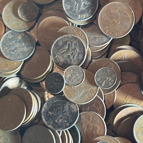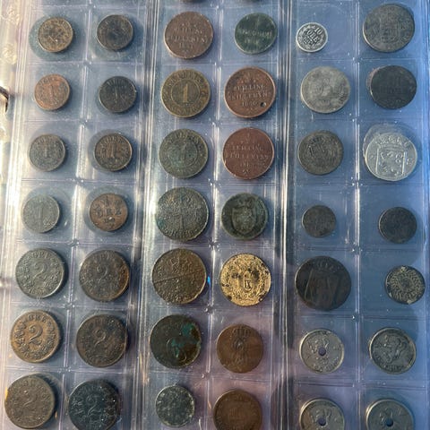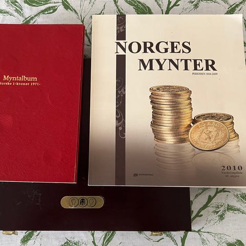 Mange pene mynter i kv01 opp til kv0 innimellom, men gjennomgående albumbelegg (grønn irr, skal vel kunne fjernes med acetone f.eks. har jeg hørt)