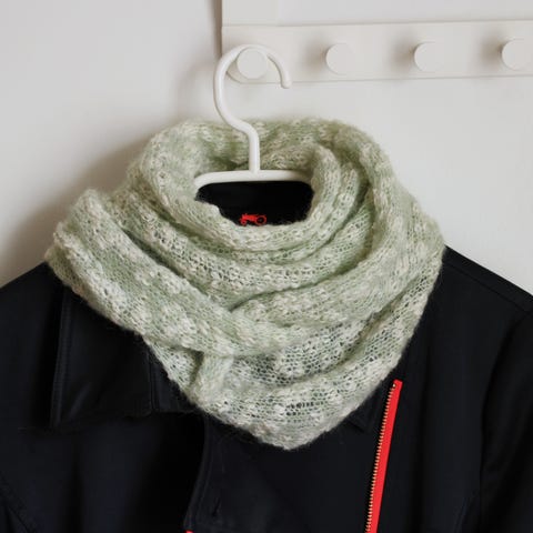 Håndstrikket trekant skjerf i lys turkis med små fargerike prikker.