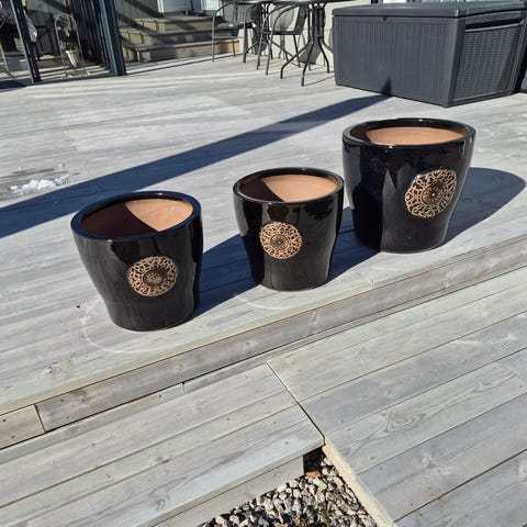 Selger to stilige veggmonterte blomsterpotter i sort farge. Moderne design som passer perfekt både inne og ute – på vegg i stue, gang, terrasse eller balkong. Pottene selges uten planter.