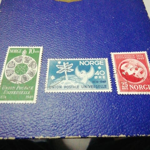 Gamle frimerker fra Norge. Meget pen stand. Se bilder! Som nye! Oppbevart i konvolutter. Henger sammen / deler av ark. Merker. Verdens postforening / union postale. Totalt 10 stk. 1949