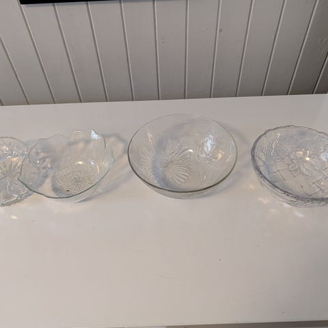 Glassbolle i pressglass. Bredde 17 cm, høyde 7 cm. Kr 50,-