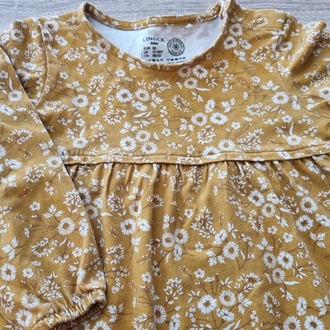 Kjolen er gul med blomsterprint i lyse farger. Den har lange ermer, knappelukking foran og rynket skjørtparti fra livet og ned. Stoffet fremstår som lett og mykt, egnet til hverdagsbruk og enkle selskapelige anledninger.