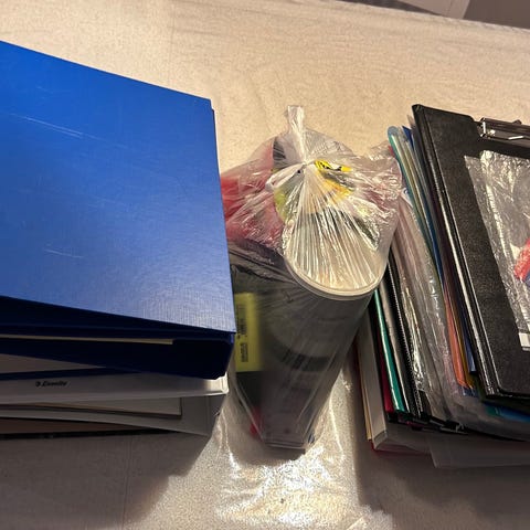 12-i-ett mini-skrivesakersett: stiftemaskin, linjal, saks, viskelær, målebånd, klips, kutter, stifter, vannlim, oppbevaringsplass, tape, bæreveske.