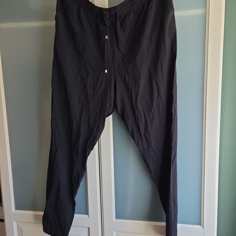 Herlig, svart bukse i tynt viskosestoff. Fra Lindex, modell Ava, str L. Men passer fint en XL, i alle fall i bredden 😅 strikk og knytting i livet, har lommer og er ellers løs og ledig. Må sys litt i linningen bak i rumpa (se bilde), og selges derfor billig 😃