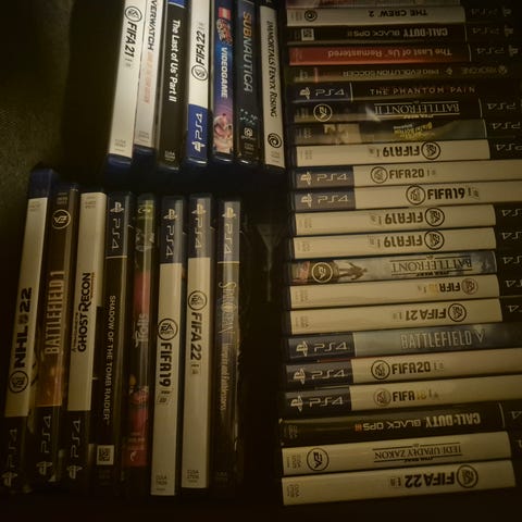 Selger en bunke med spill (duplikater) fra spillsamlinga. Spillene har ikke vært testet på en stund, men fungerte sist de ble brukt.