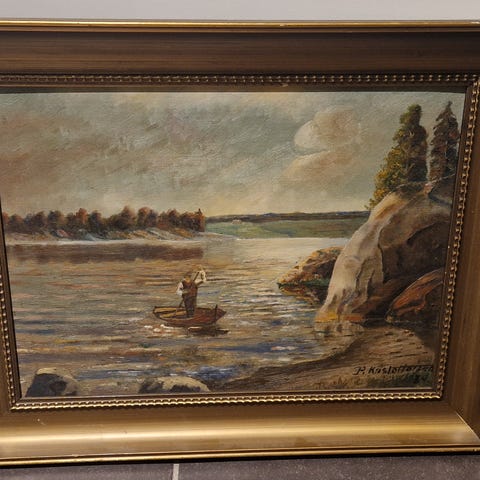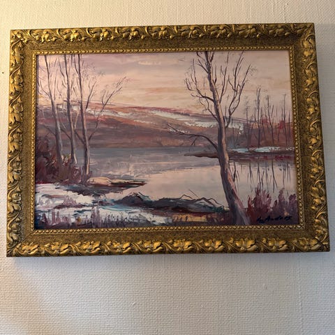 Vintage Mid Century Landscape Originalt oljemaleri med treinnrammet. Det er signert fra artist til venstre nedenfor. Funnet i Ålesund, Norge.