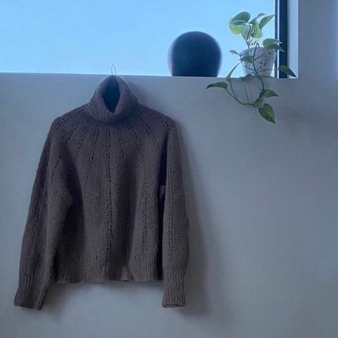 Jeg må redusere gensermengden min. Derfor selges denne fine, myke genseren strikket i tynnalpakka, Soul babyalpakka og Air-sur-alpakka.