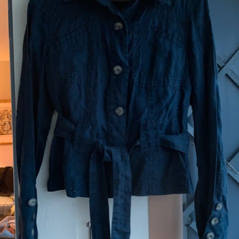 Vintage, mørk blå, kort linjakke, blazer med lange armer og 4 knapper. Kontrastsømmer. 2 små lommer. Dobbel ruffle/peplum bak. 100% lin.