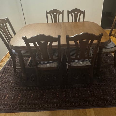 Selger dette solide spisebordet med stoler, da vi skal over til ett annet bord. Veldig romslig bord og gode stoler. Det er noe bruksmerker på bordplaten.