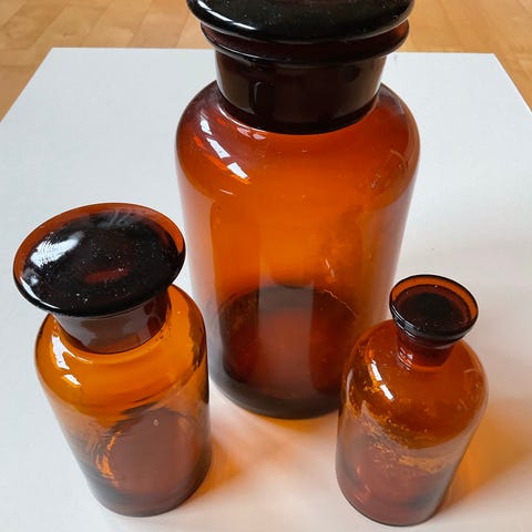 Selger 4 ubrukte brune apotekflasker på 100 ml hver. Flaskene er såkalte "New Old Stock" (NOS), og har aldri vært i bruk. Perfekt til dekor, oppbevaring av oljer, essenser eller som rekvisita i fotoprosjekter og film.
