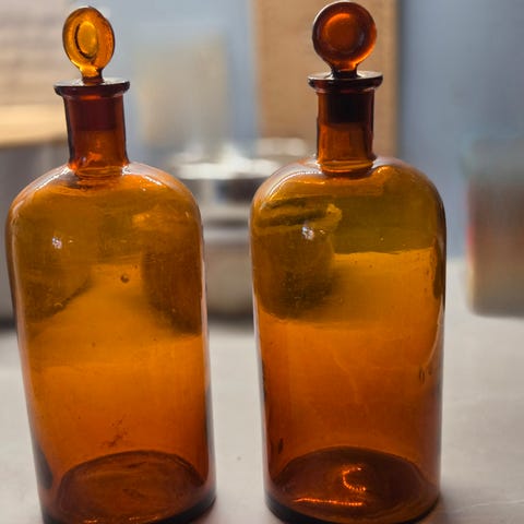Apotekflaske, kjemiflaske, labflaske, brunflaske, dråpeflaske, retro, vintage, antikk, industriell dekor, laboratorieflaske, laboratorieutstyr, filmrekvisita