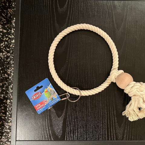 Har 1 stykk hjemmelaget hampehuske til undulat som selges. Diameter på sirkelen er 18 cm. Båndet til husken har lengde 23 cm. Selges for 100 kroner