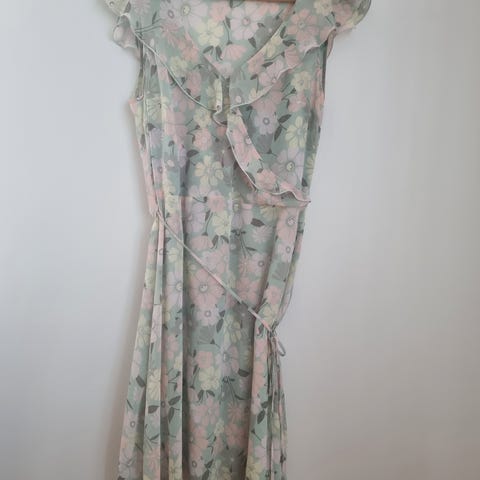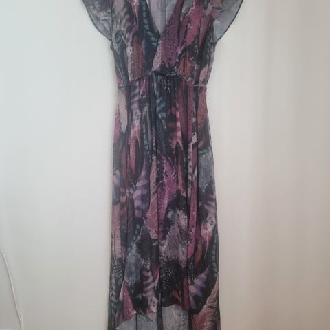 Ny kjole med splitt foran nede på venstre side, Veldig fin på. Kjolen er i 100% viskose, krøller ikke og er litt lengre bak enn foran- noe som gir et stilfullt uttrykk. Str 34. Kom gjerne og prøv den. Selges ke 130,- (ord. pris 400,-) Hentes sentralt i Tromsø. Kan evt sendes , men da med vanlig postgang og mot betaling av porto.